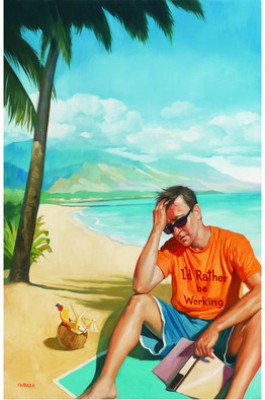 The water's blue, the waves are lapping. Geez, it's hot. Do I have enough sunscreen on? Why did I wear this bathing suit? How long have we been here? I wonder what's happening at the office. Have they finished that project? Where is that cellphone? Wait, don't tell me there's no service!